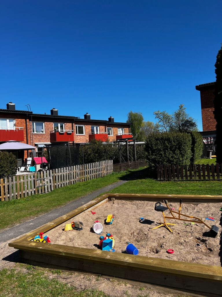 Varje hem har en eller två uteplatser, och många har dessutom en härlig uteplats under tak – perfekt för långa sommarkvällar. För barnfamiljer finns två lekparker med gungor och sandlådor, och för den som vill slippa egen tvättmaskin erbjuder vi en nyrenoverad tvättstuga med moderna maskiner, torktumlare och torkrum.